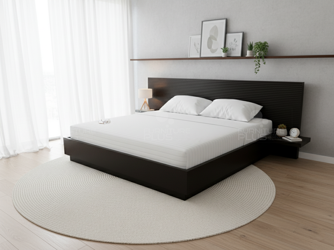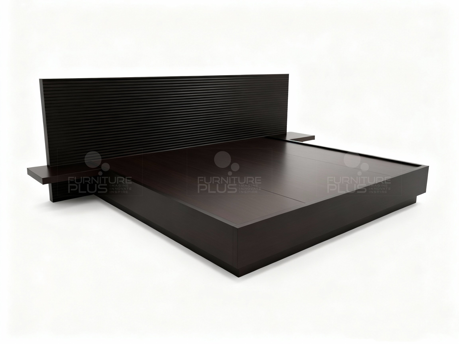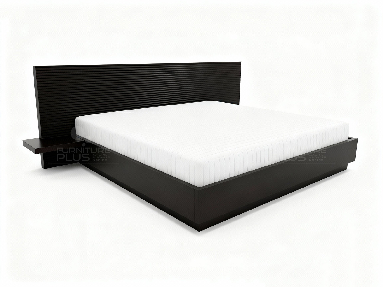 This one-of-a-kind Kate platform bed is fiercely fashionable with the horizontal grooved patterned headboard and the two hanging bed side shelves together with the floating effect supportive base. This unique design is made of solid Mahogany timber that will last for many years growing more graceful with age.