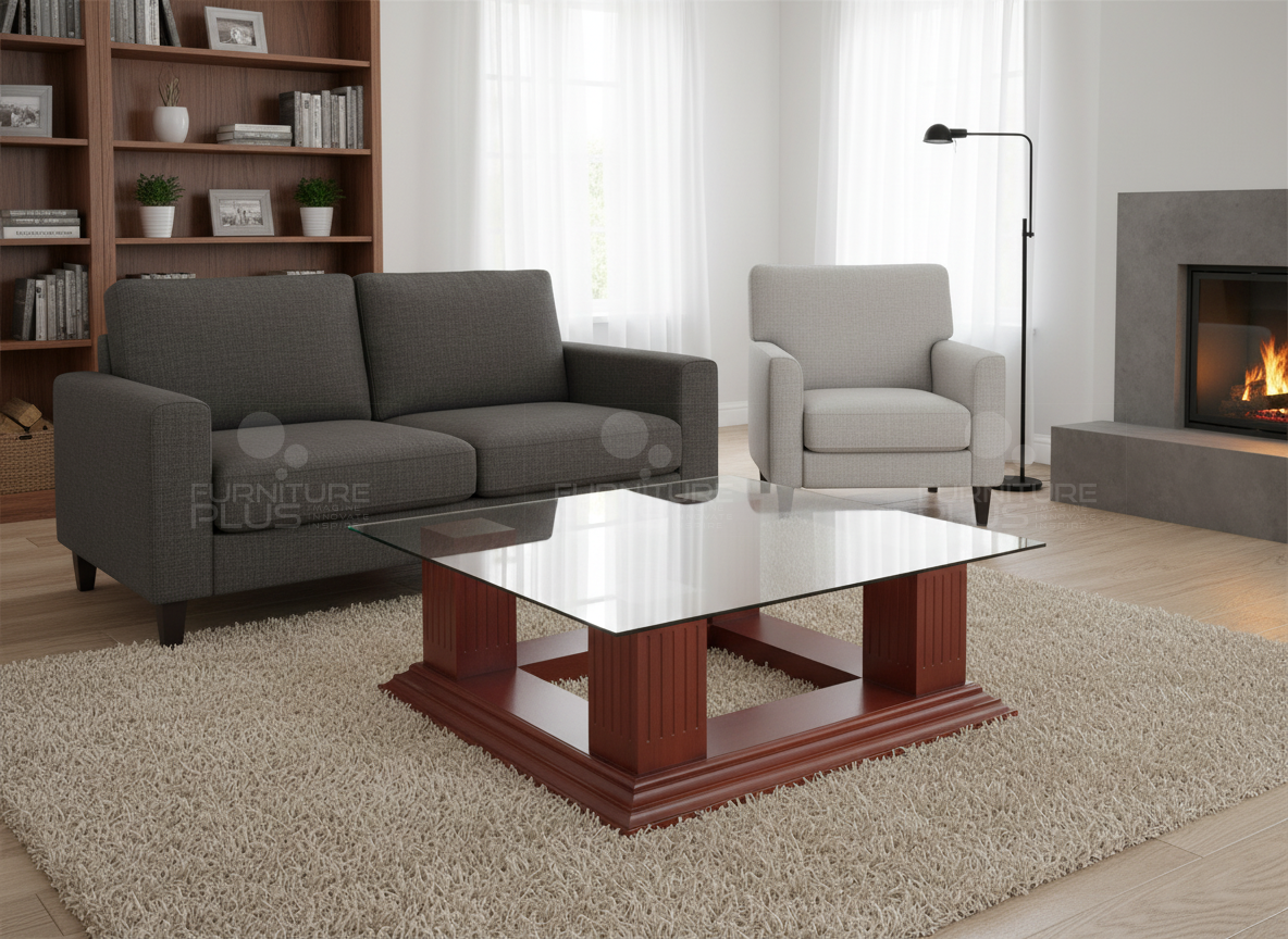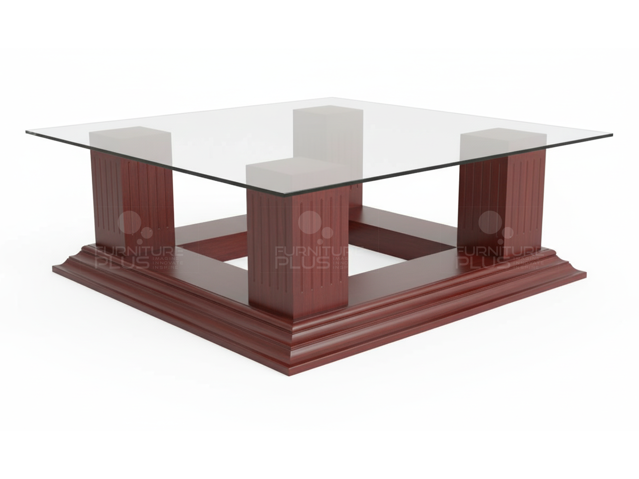 The designer base frame and the pillar type legs with a clear glass resting on it is a stunning design confirming the master craftsmanship. The hardwearing natural Mahogany timber will last for many years growing more graceful with time. The glass top is stain resistant and easy to clean. Can be produced in square shape.