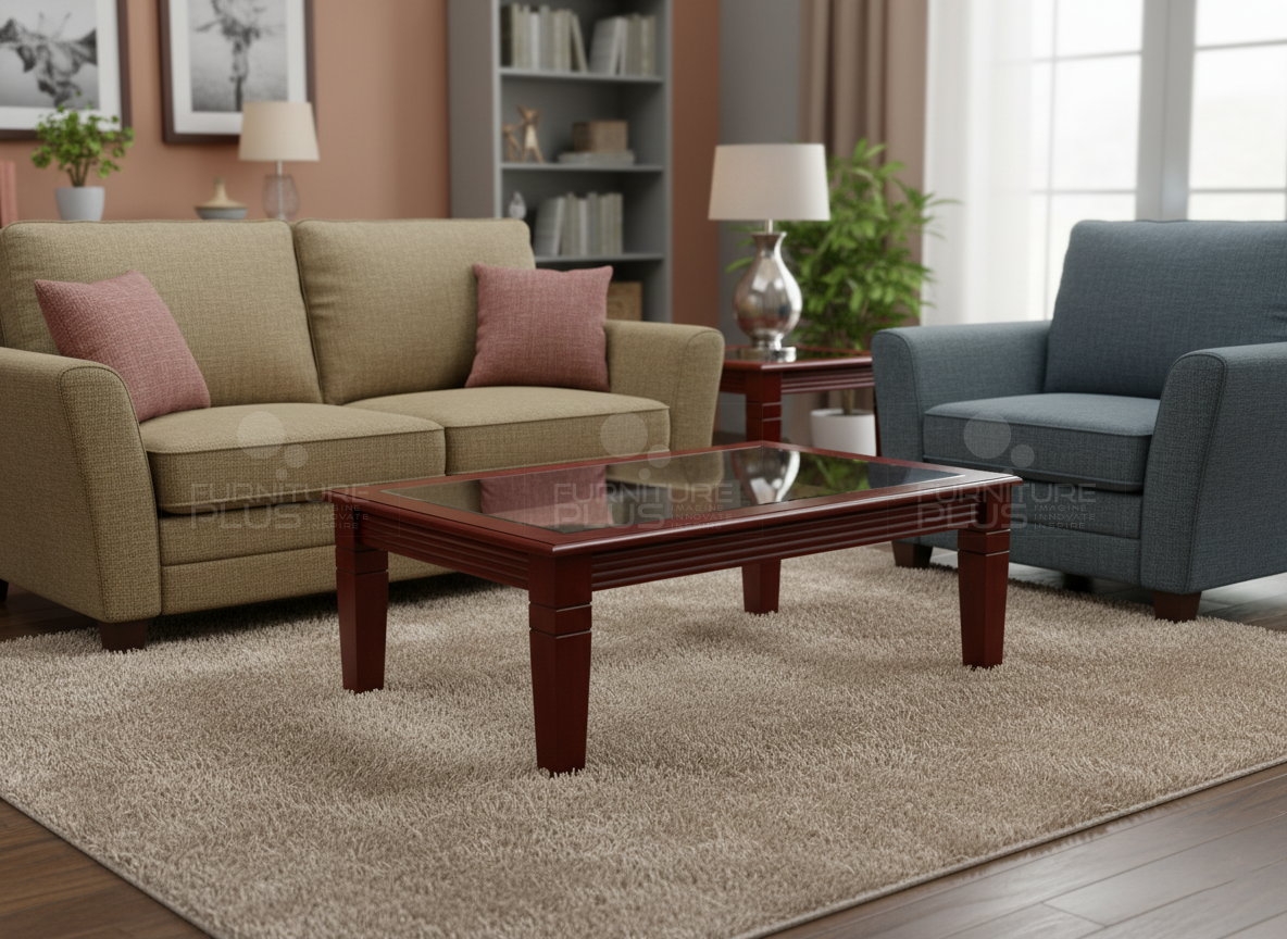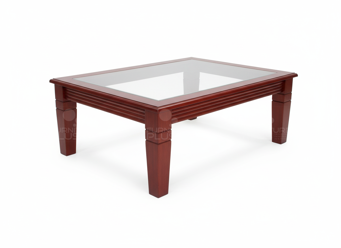 Made of solid Mahogany timber which is a hardwearing natural material. Table top in glass is stain resistant and easy to clean. The simple coffee table with unique grooves on frame is an outstanding design.