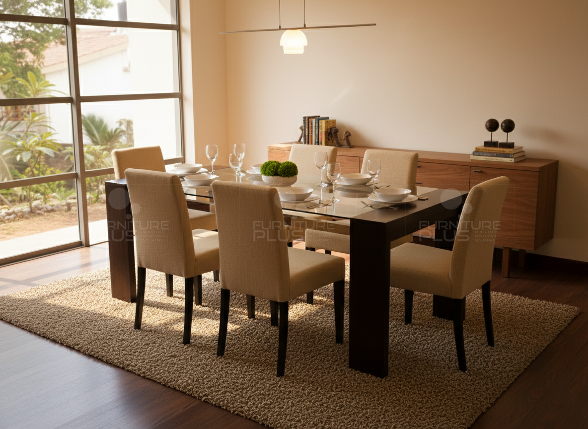The U-shaped panel legs are combined with 2” x 2” stainless-steel box bar frame and with a 10mm clear glass top. This fashionable glass top dining table with modern lines will certainly capture the attention of guests and they will for sure fall in love with it.