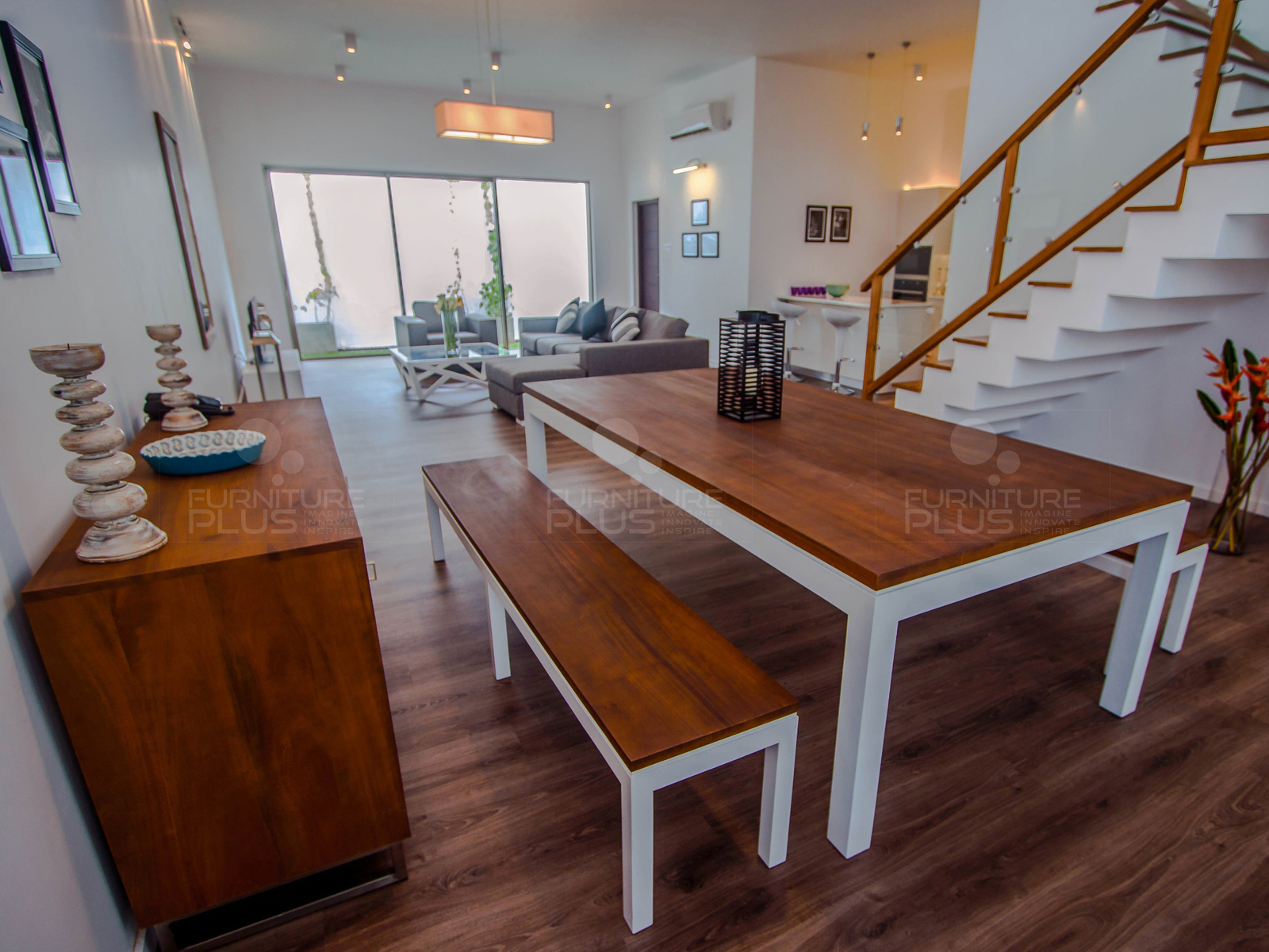 The Grady dining table is uniquely crafted with authentic planks using solid Mahogany timber that will last for many years growing more graceful with age. The solid top joined to chunky square legs really adds a presence to the dining room not only as a gathering spot for family and friends, but also as a focal point in the home. The two-tone finish in white and light mahogany colour enhances the beauty.