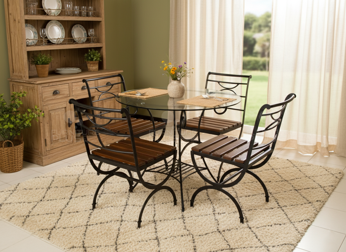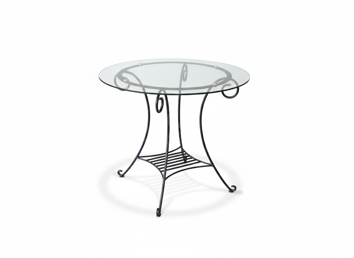 This glass top circular table with the wrought iron base is ideally suited for a small dining or entertainment area.