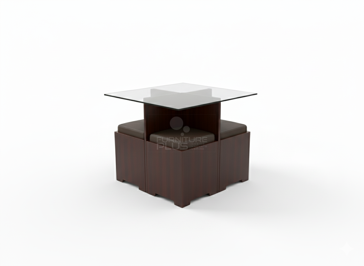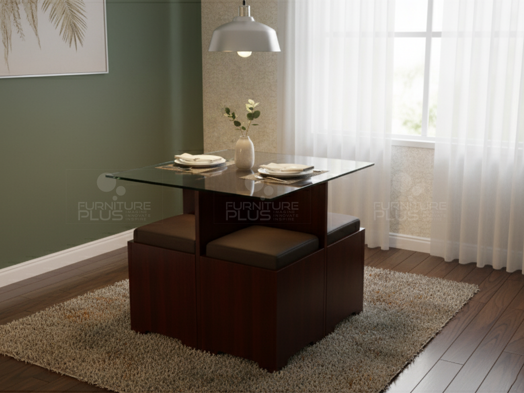 Samuel is an ideal companion to a pantry/kitchen area with a small space. It gives a minimalistic look by the clear glass top resting on a cross design base frame which is made out of solid Mahogany timber. The addition of solid Mahogany stools with upholstered seats could be easily pushed inside thereby enabling a high utility value.