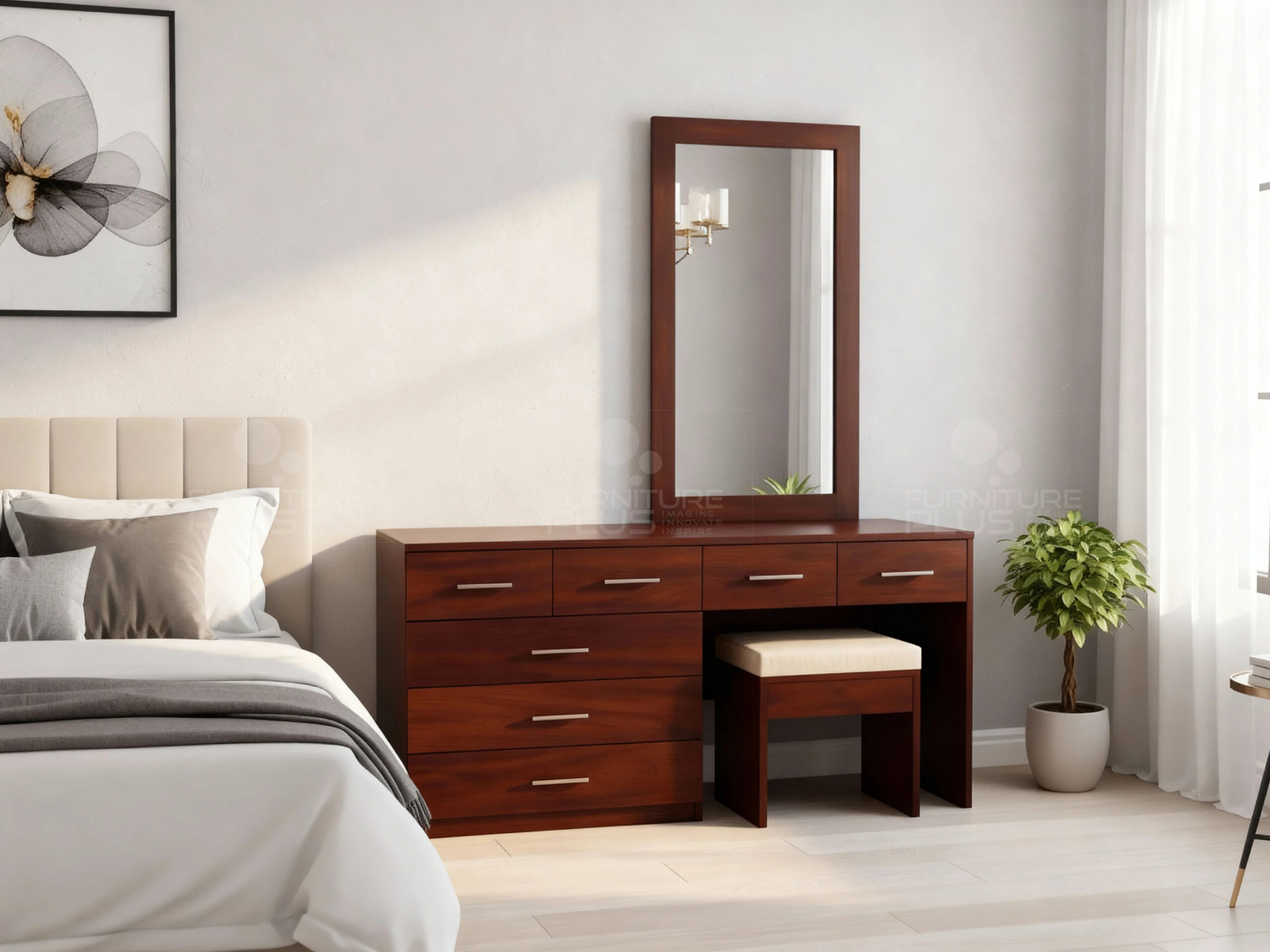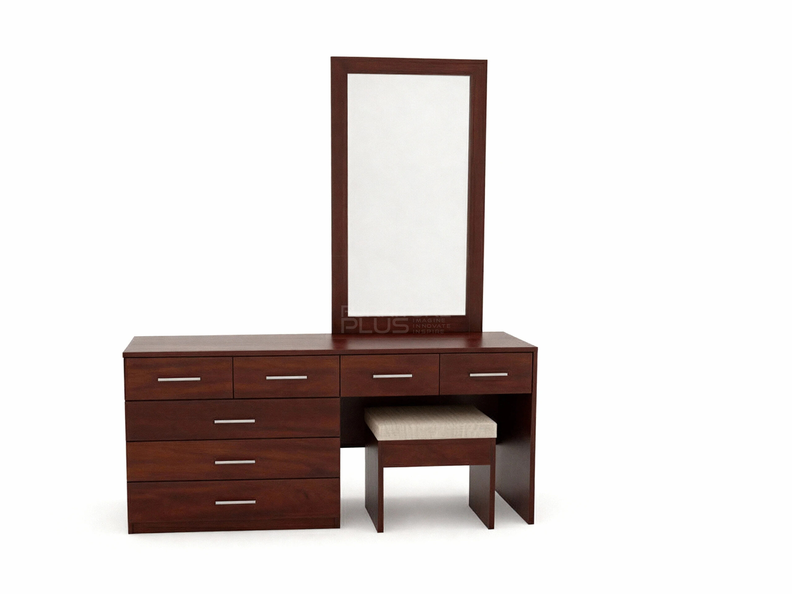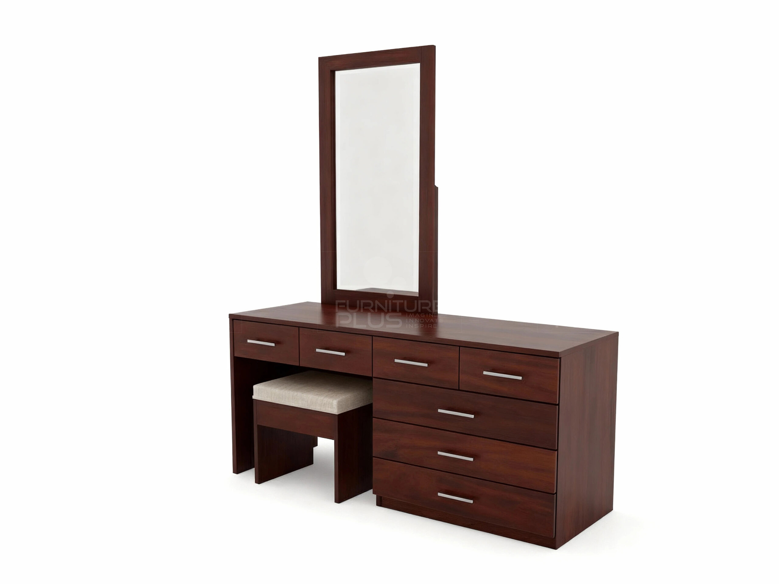 Get yourself this elegant dressing set. The superior design and construction quality sets this Martha dressing set aside from the others and for sure it will fit in with all kinds of interiors and look. This contemporary set includes a chest of three large and four small drawers and a large counter top that can conveniently accommodate a lot of storage space for all your makeup, toiletries, jewelry, accessories, linen and many more in a fashionable, organized style. The mirror with frame enables you to sit and apply your makeup and do your hair styles. Martha is made to last for years out of solid Mahogany timber. Dressing stool (if required) is priced separately.