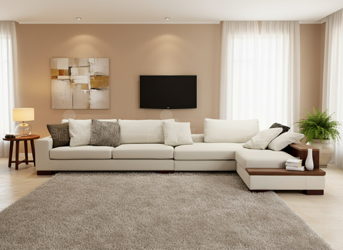 This fully upholstered sectional sofa signifies the simplicity in timeless design and is suited to any environment. Spot the solid timber book arm and drop arm plate that provides space for storage of magazines and beverages. A stunning look is given by the mix of larger and smaller cushions.