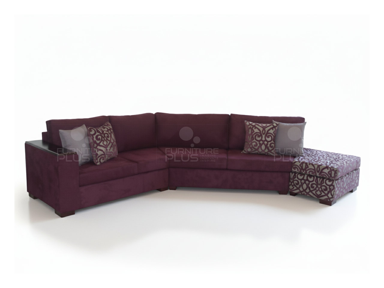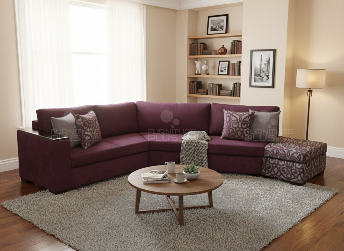 A comfortable trapezoid shaped seating arrangement complimented with a humpty that could be moved to any preferred location. By adding a solid timber plate on one arm and matching throw pillows it enhances the beauty of this sectional.