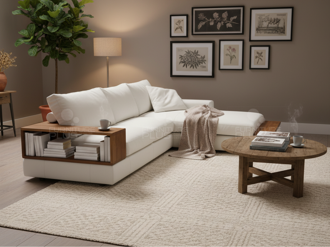 This fully upholstered sectional sofa is a preferred option for modern day living. The timeless design with its solid timber book arm and drop arm plates is an ideal option for storage of magazines and beverages.