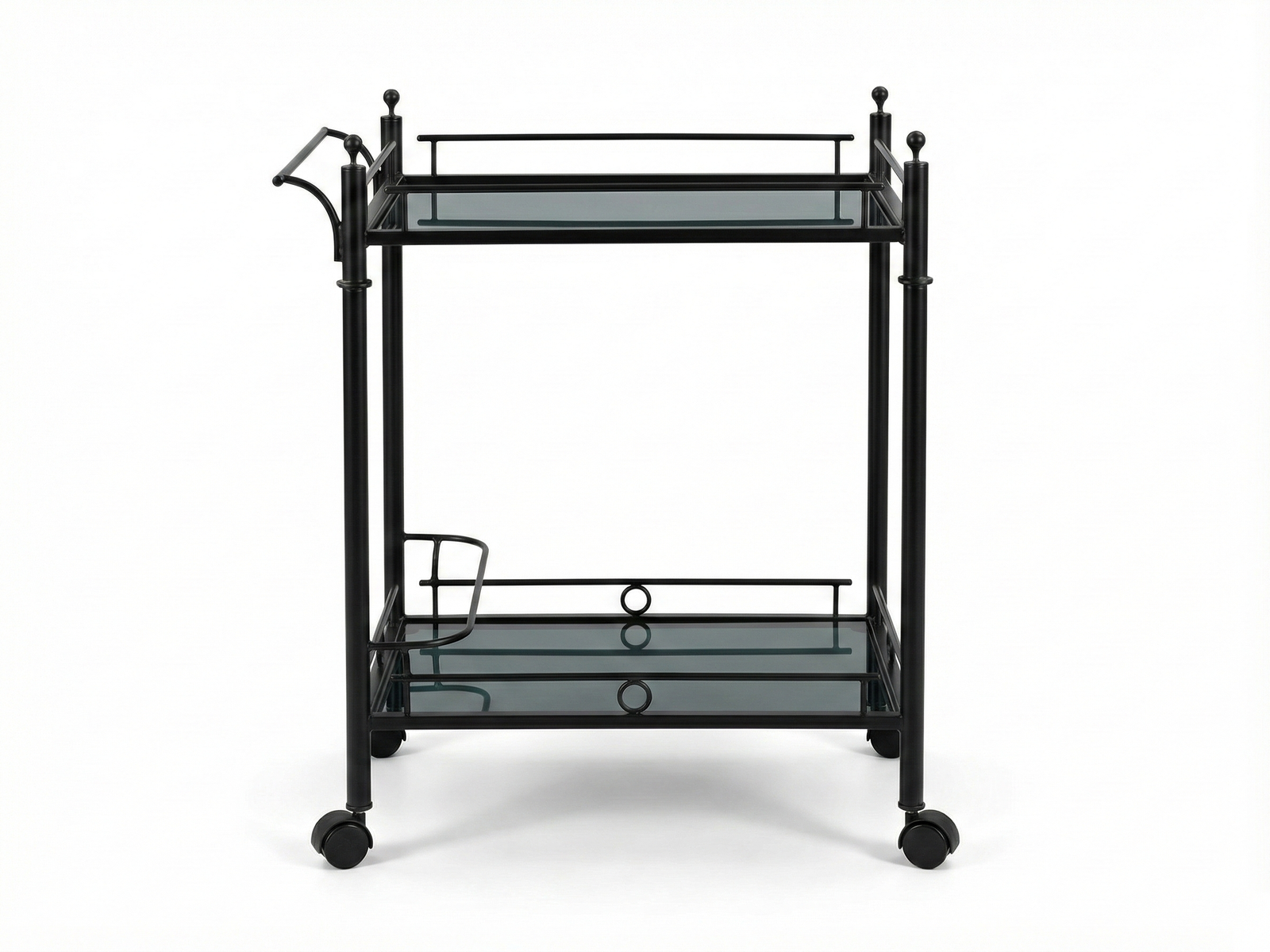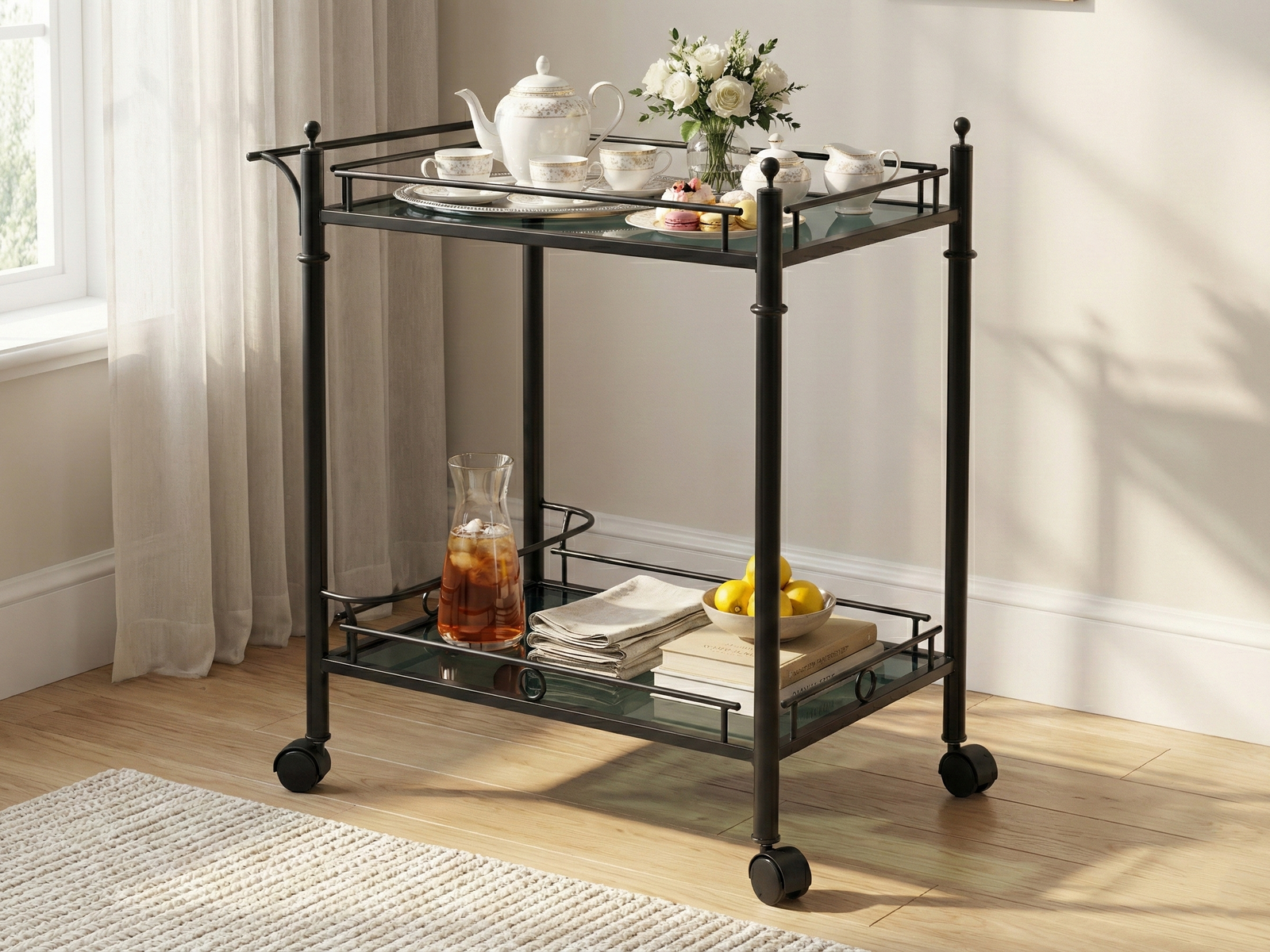 Whether as a mobile house bar or serving trolley, Lipton is always close at hand and at your service. It is useful to have around the house and you soon won’t want to live without it. On smooth-running wheels, Lipton transports and serves everything you need for entertaining, teatime and dinner safely and in style. It is made out of steel, painted in matte black and has two stable glass trays which could be easily cleaned.