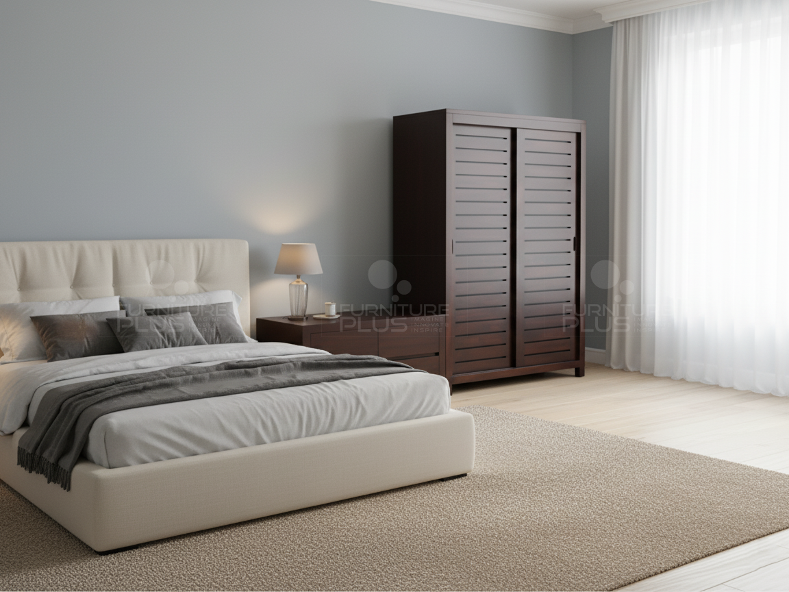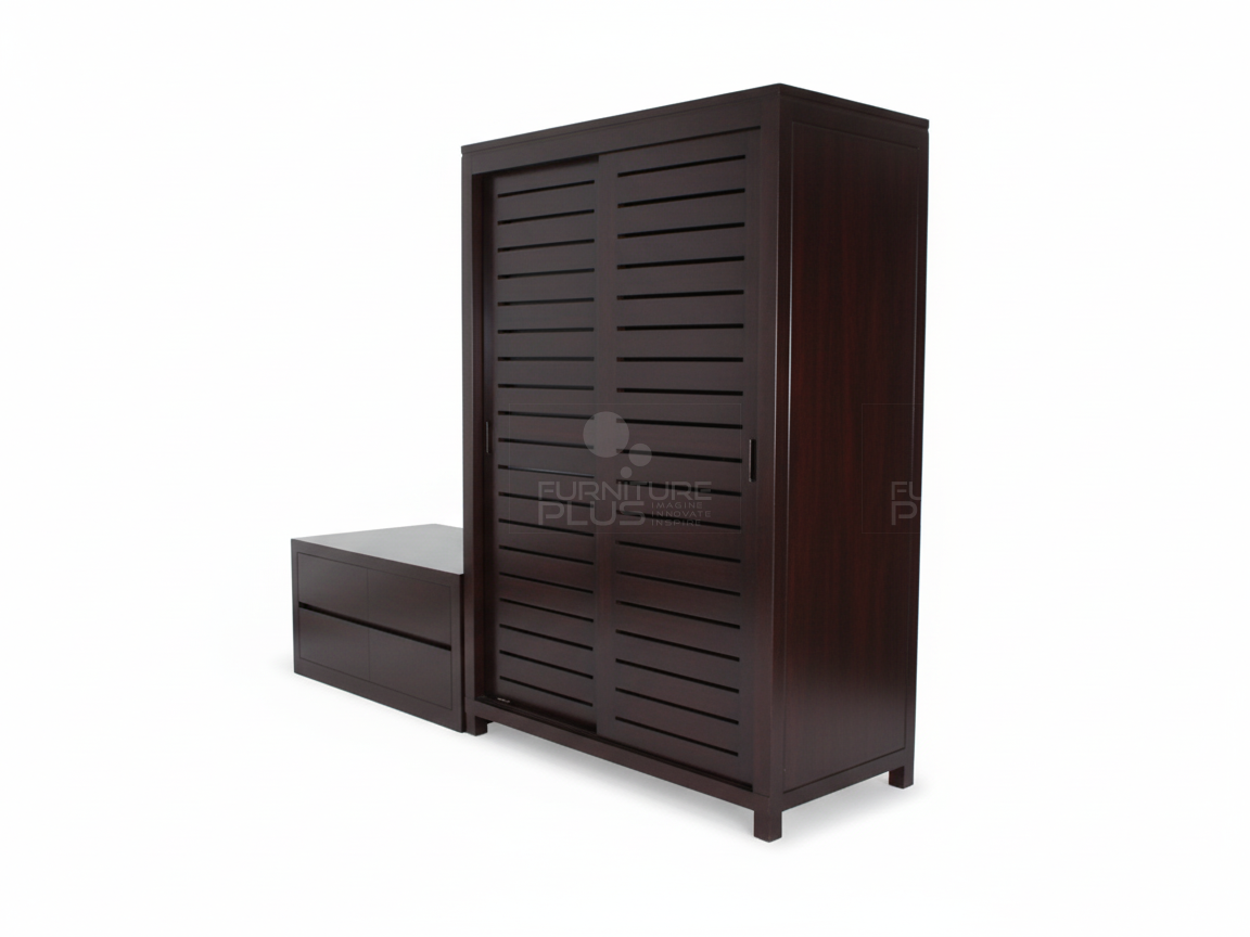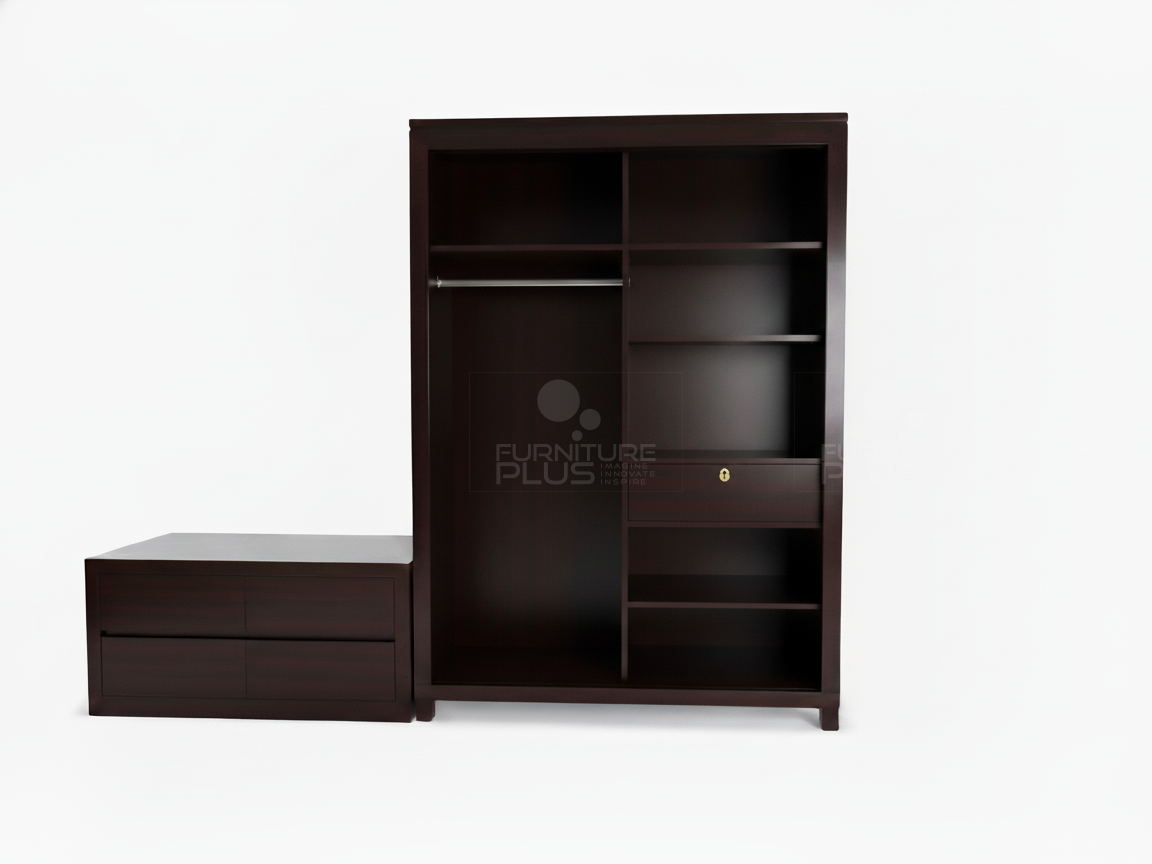 The Glasgow wardrobe cum luggage rack/ TV console unit featuring a contemporary design is suitable for a hotel room or to anyone having a similar requirement. It is classily designed with a wardrobe of two sliding doors having pass through groves and a luggage rack / TV console consisting of four drawers. The internal details of wardrobe is designed with hanging rod, shelves and a drawer. The Glasgow set is made out of solid Mahogany timber that will last for many years growing more graceful with age.