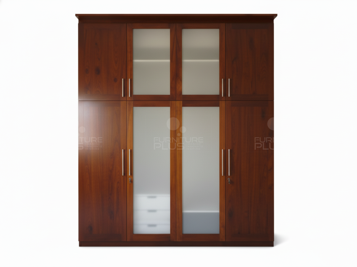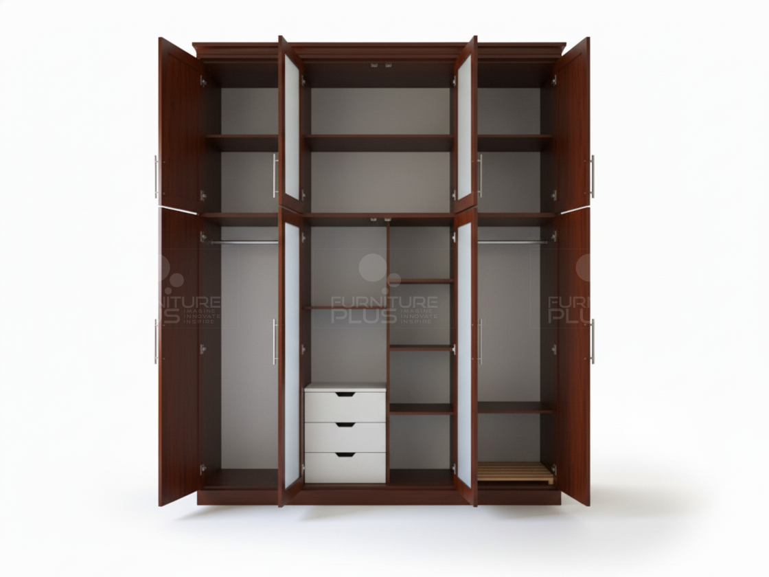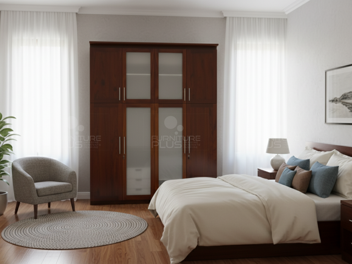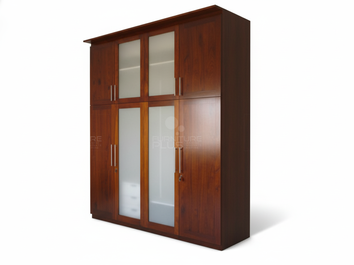 The Harfordshire wardrobe is a perfect solution for apartments or residences where maximum space management is an eminent factor. This exquisite wardrobe consist of eight swing doors of which four are glass doors with frosted sticker and the wardrobe is made in two units consisting as top and bottom units creating the smart essential storage space that’s otherwise been ignored by many. The internal details of the bottom unit is designed with hanging rods, shelves and two drawers. This modern unique master piece is crafted out of solid Mahogany timber that will last for many years growing more graceful with age.
