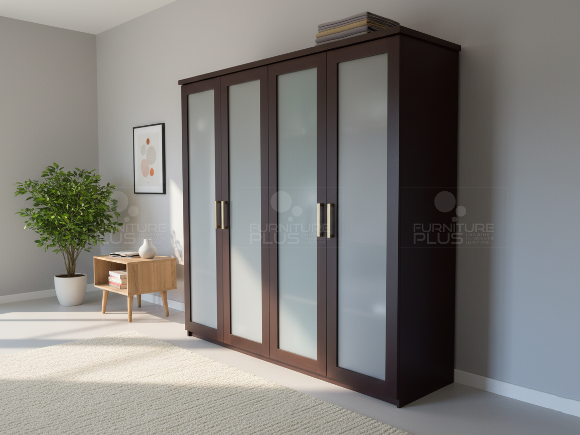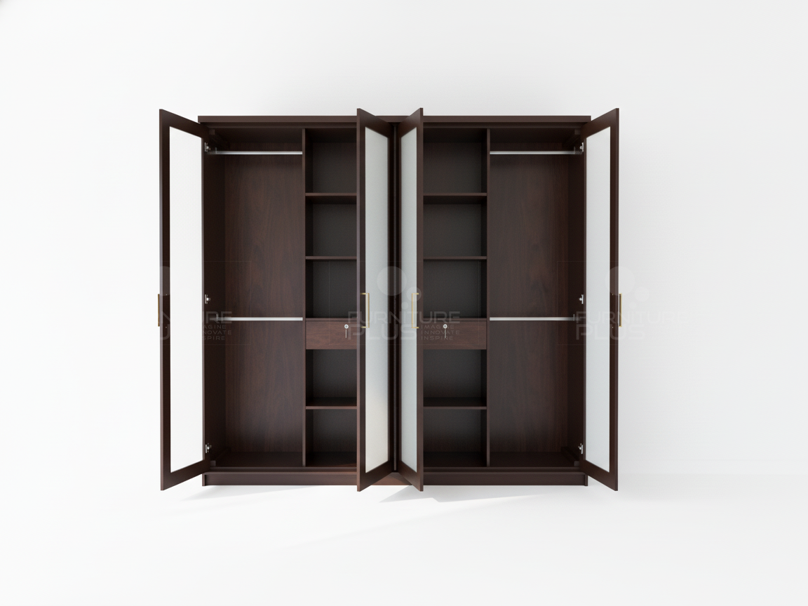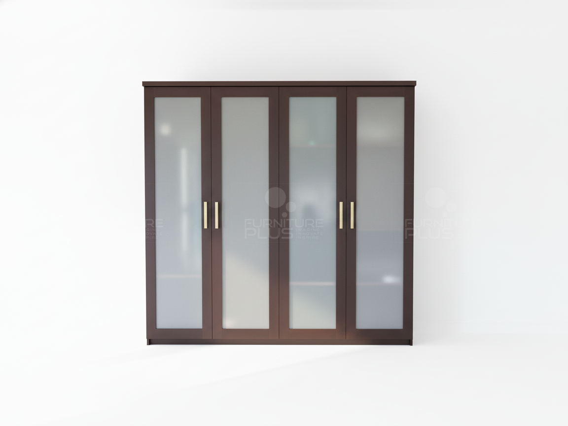 The Lorde wardrobe is an elegant piece with a modern touch that compliments with many interior themes. This exquisite wardrobe consist of four swing glass doors all with frosted sticker. The internal details of wardrobe is designed with hanging rods, shelves and two drawers. This Lorde wardrobe is made out of solid Mahogany timber which is a very durable natural hardwood.