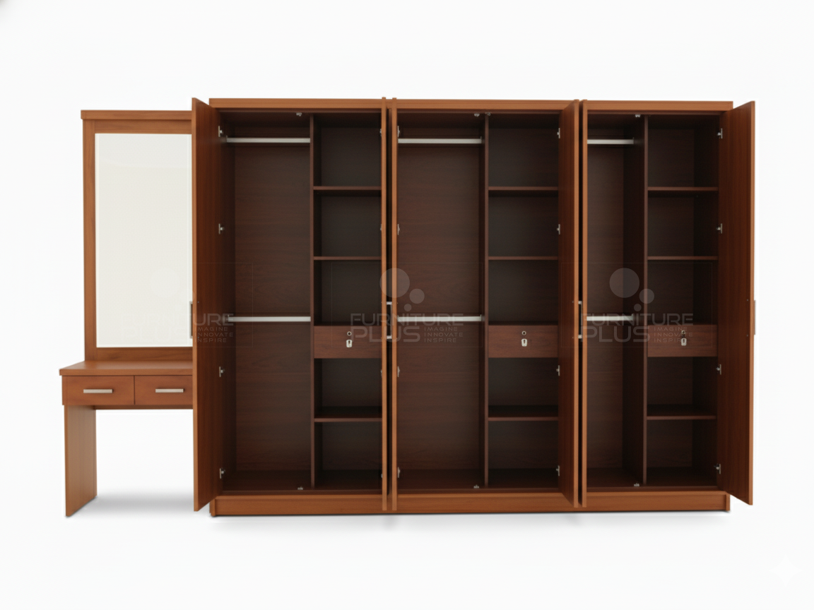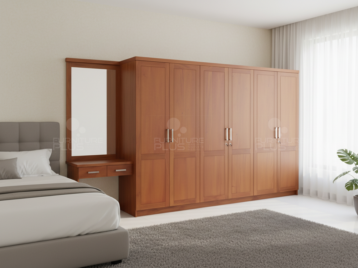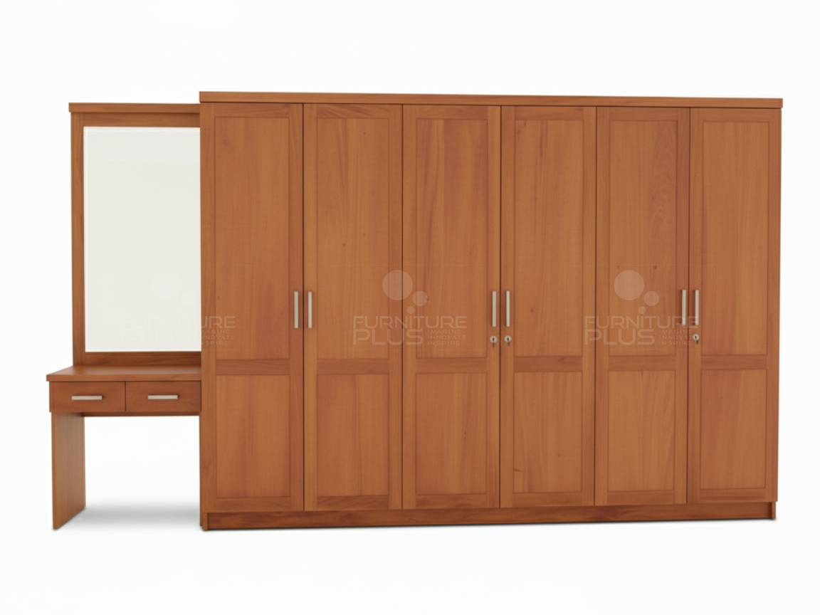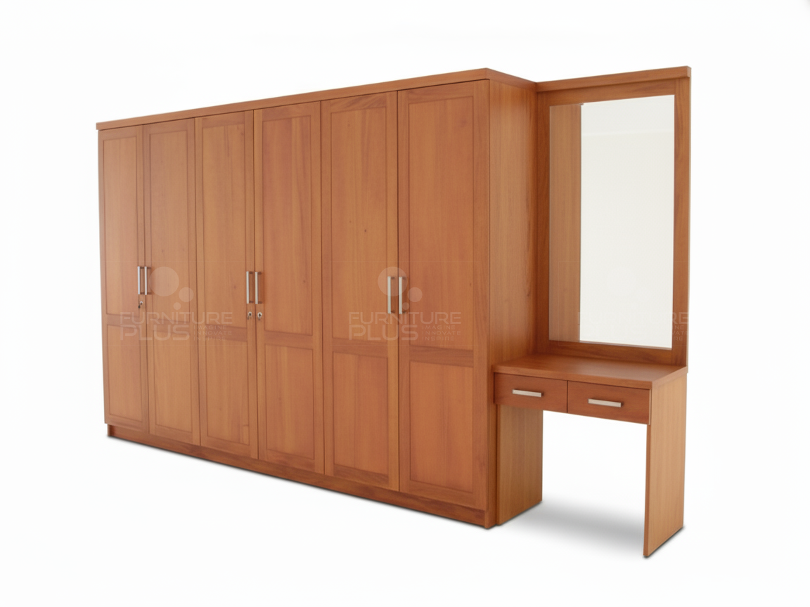 The Southampton wardrobe cum dresser unit is an impressive set of furniture and is a perfect & spacious solution for many bedrooms. This exquisite design consist of a wardrobe with six swing doors, dresser with two drawers and a combined mirror with frame. The internal details of wardrobe is designed with hanging rods, shelves and three drawers. The Southampton set is made out of solid Mahogany timber that will last for many years growing more graceful with age.